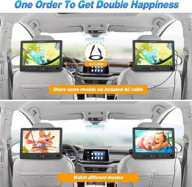 - 100% No-Risk OrderingDESOBRY has decades of experience in car DVD players, we provide 1 year guarantee, lifetime professional customer service & technical support. What You GetPakage includes 2*Car DVD Player, 1*Car Charger (with 2 sockets), 1*AC Adapter, 1*AV Cable, 1*RCA Cable, 2* Earphone, 2*Mounting Bracket, 2* Remote Control, 1*Screwdriver, 1*User Manual, 1*Quick Star G
