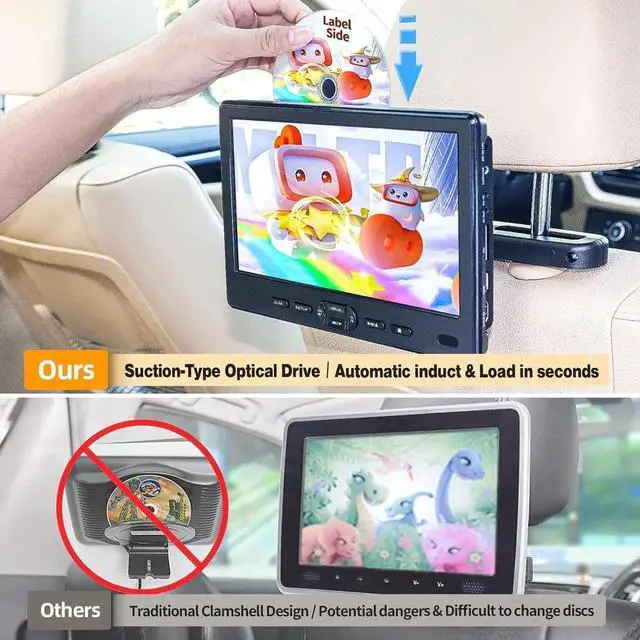 R, DVDR, DVD- 3S Auto Load Discs & Last MemoryOur headrest DVD player for car with Suction-Type Disc in design, not only protects the player loader, but also loads the disc automatically, super easy for adult on front seat or kids on back seat to change dics. Besides, the DVD players with last memory function, every time start from where you leave, time-saving