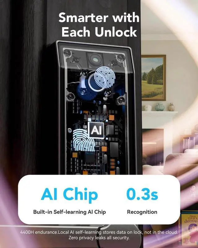 Fingerprint Biometric TechnologyAdopting an advanced 3D biometric-based fingerprint sensor, the smart door lock ensures bank-level security for your home. Different from optical fingerprint, the biometric door lock can quickly identify your fingerprint within 0.5 s, with an accuracy of up to 99.2 %, avoiding being unlocked by copied fingerprints.