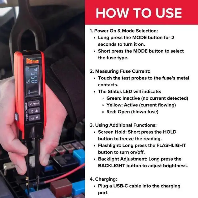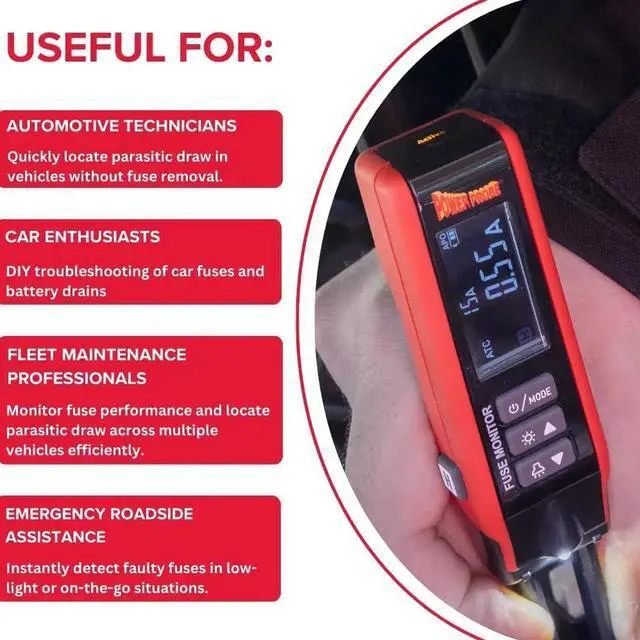The Fuse Monitor (PPFUSE) is used to locate / isolate which circuit parasitic draw lies on by measuring current across fuses witt removing them. The PPFUSE can be used on Maxi, Mini, & ATC fuses with a maximum A rating of 80A. The PPFUSE calculates a draw based on fuse size in real time. Quantify the amount of parasitic draw on your vehicle with the revolutionary PPDRAW & locate it with the all new PPFUSE! The PPFUSE is USB-C rechargeae, comes with a belt clip, replaceae tips, and a work light.
