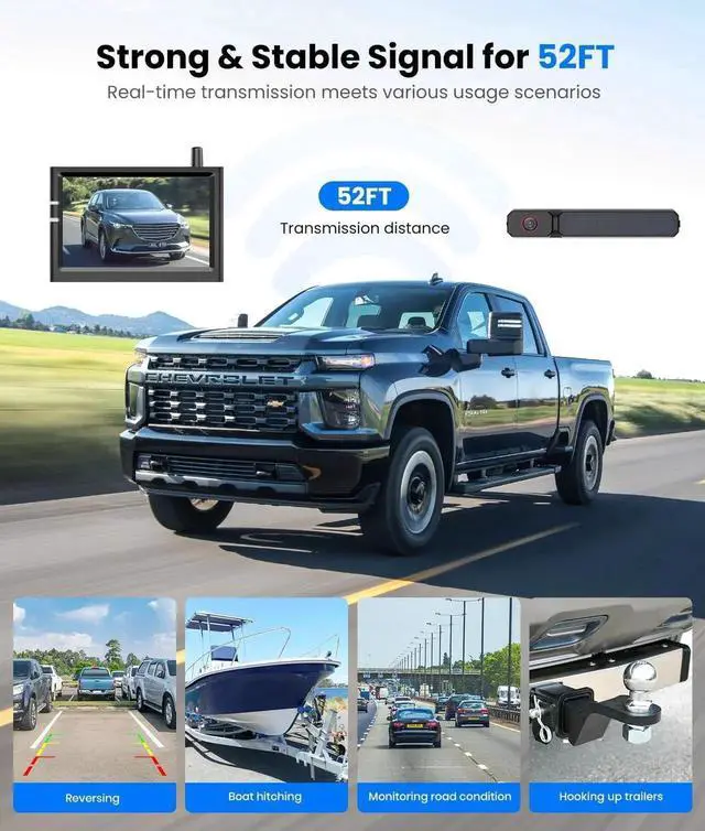 Wireless Signal: The wireless backup camera for trucks uses 2.4G digital technology, offering a lag - free experience within 40ft. It's great for pickup trucks, cars, horse trailers, SUVs, vans, boats, etc. The wireless backup camera with a 5" monitor delivers colorful and delicate images day and night. No more annoying blurry or discolored screens and picturesIP69K