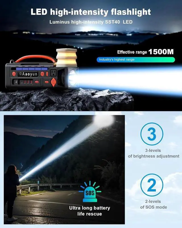 - 360° Camping Lighting Design: Experience 360° illumination with 6 lighting modes and dual-light with 4 adjustable settings. Equipped with a USA-imported Luminus 20W high-intensity LED, it doubles as a powerful flashlight with an effective range of 1500M. The outdoor generator also features SOS and strobe lighting modes, ideal for off-grid activities or nighttime operations. Never feel panicked with this emergency light!