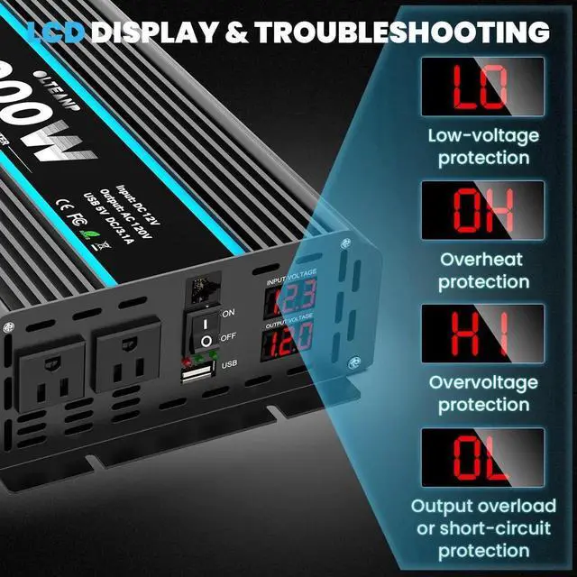 - LCD DISPLAY MASTER THE INVERTER WORKING STATUS-Youcan get troubleshooting from the LCD display to adjust theinverter and your battery.It will show the LO(low voltage shutdown),OH(over heat shutdown),HI(over voltage shutdown),OL(output overload or short-circuit shutdown).Control theinverter status easily.