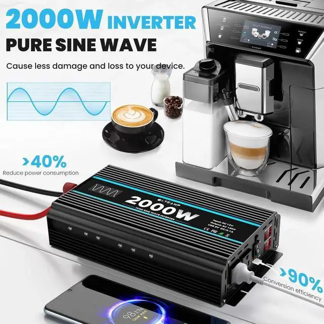 - POWERFUL 12V DC-110/120V AC CAR POWER INVERTER-With professional and advanced technology 2000 watts pure sinewave power inverter, you'll be able to charge and power yoursmartphones, laptops, entertainment devices, small-sizedappliances, and other mobile devices.