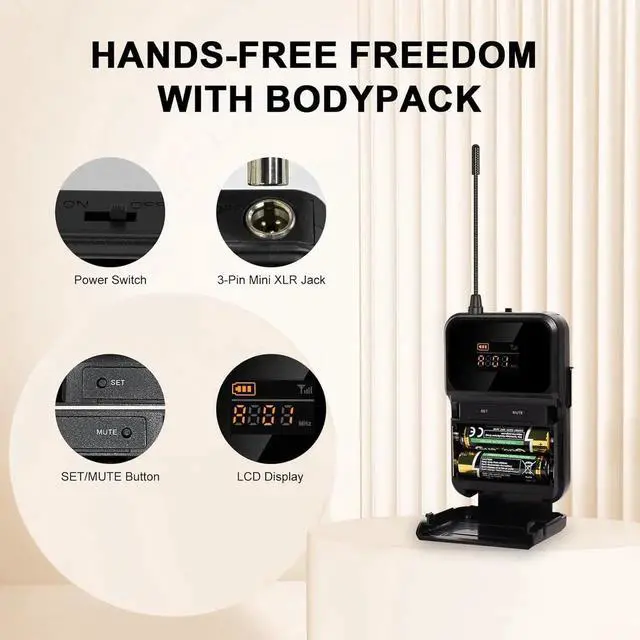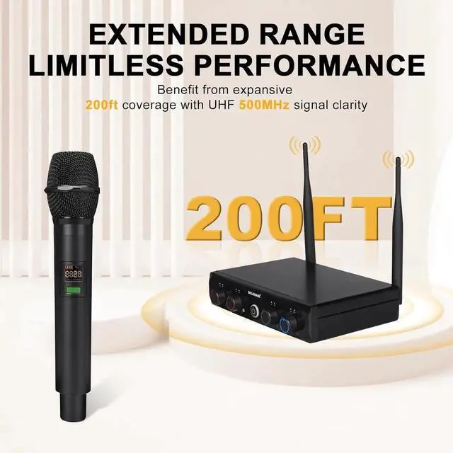 - FLEXIBLE SEAMLESS PERFORMANCE: Operating within the UHF 500MHz range, the wireless microphone delivers expansive 200ft coverage with interference-free performance. Meanwhile, its 4x10 frequency groups support the simultaneous use of up to 8 systems, providing exceptional convenience for extensive setups. With handheld and bodypack transmitters available, our system also provides exceptional flexibility to suit diverse performance needs