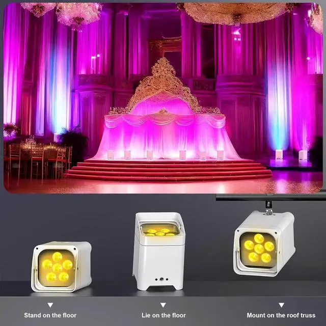 - Versatile Lighting Effects for Every Occasion Featuring 6-in-1 RGBWA UV LED beads, rechargeable stage lighrs create stunning lighting effects, including color selection, color shade, color pulse, color transition, strobe, and fade, ect. So our battery powered uplights is perfect for party, show, home, church, theater, ect.