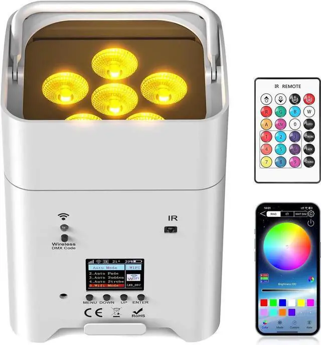 - LCD Display & Charging Progress: The wireless uplights feature an intuitive LCD display, simplifying DMX group and channel configuration. These lights are equipped with wireless DMX technology, ensuring effortless integration into your existing lighting setup. Additionally, our battery-powered par lights provide real-time charging status updates, displaying a percentage-based progress bar both when powered on and off.