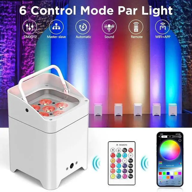 - Multiple Control Mode: The 6 in 1 led stage light have 6 control modes, it is 2.4G hz wireless DMX512, master/slave, auto, sound, remote control, wifi, mobile phone APP control (supports the IOS and Android systems)