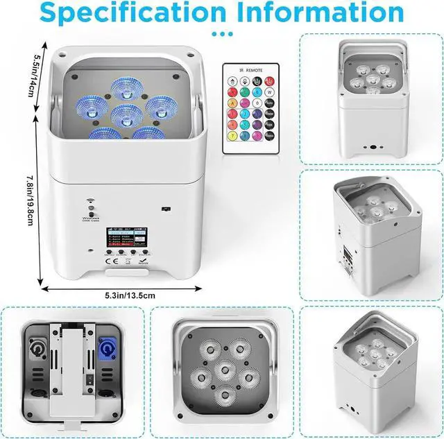 - Working Time & Colorful Effect: RGBWA+UV full brightness 4 hours, monochrome 26 hours. Static color/ Hopping/ Color combination/ Sound/ Color fade/ Jump/ Strobe/ Auto Play/ Master-Slave mode. Create customized colors using the built-in LED display, Stunning color mixing very smooth