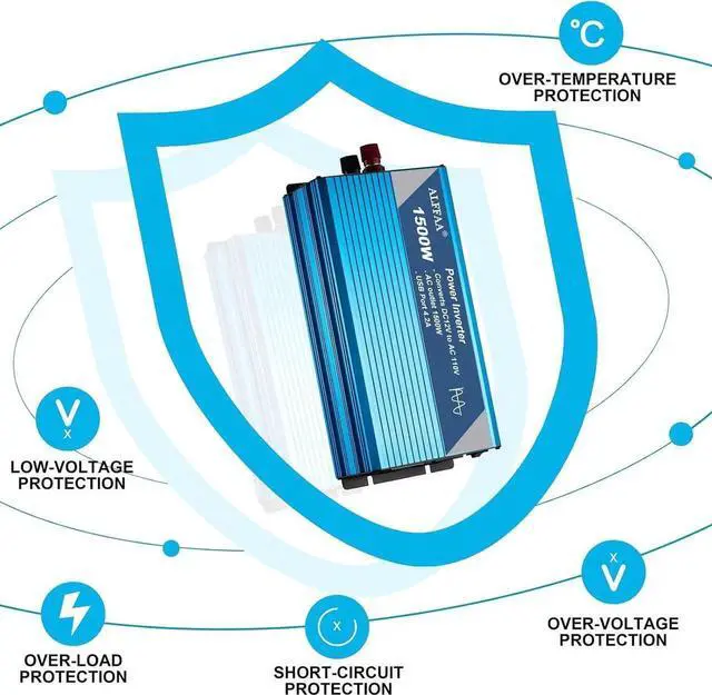- Safety Protections under-voltage and over-voltage protection, over-temperature protection, over-load protection. Cooling fans and ground-fault circuit interrupter (GFCI) protection. Two LED indicators for the input and output. And Because the Inverter maximum output current is arrive 140A, We suggest buyer use the inverter also use ALFFAA 2 AWG cables.