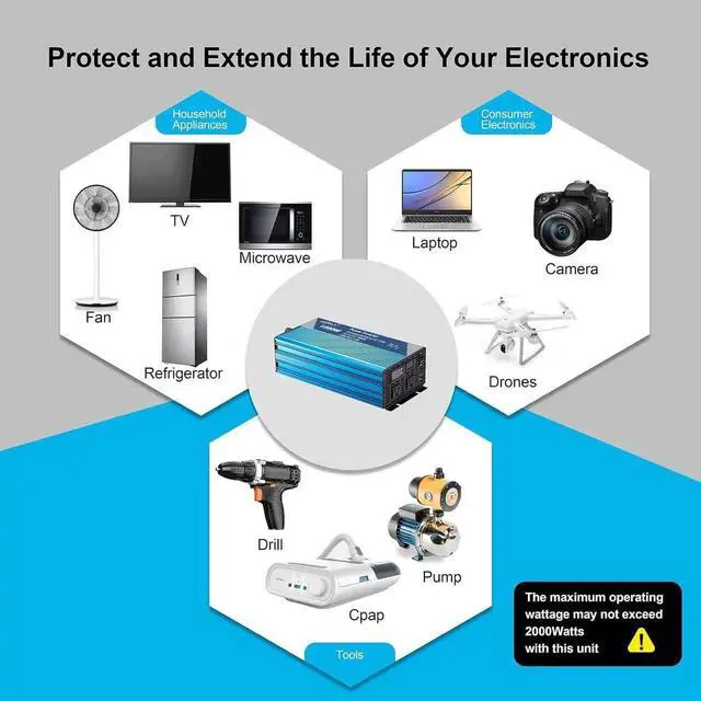 - Protect Your DeviceAdvanced pure sine wave technology provides quality AC equivalent to grid power which will protect over voltage damage your device. With its quiet and high inductive loads, no Annoying buzzing sounds