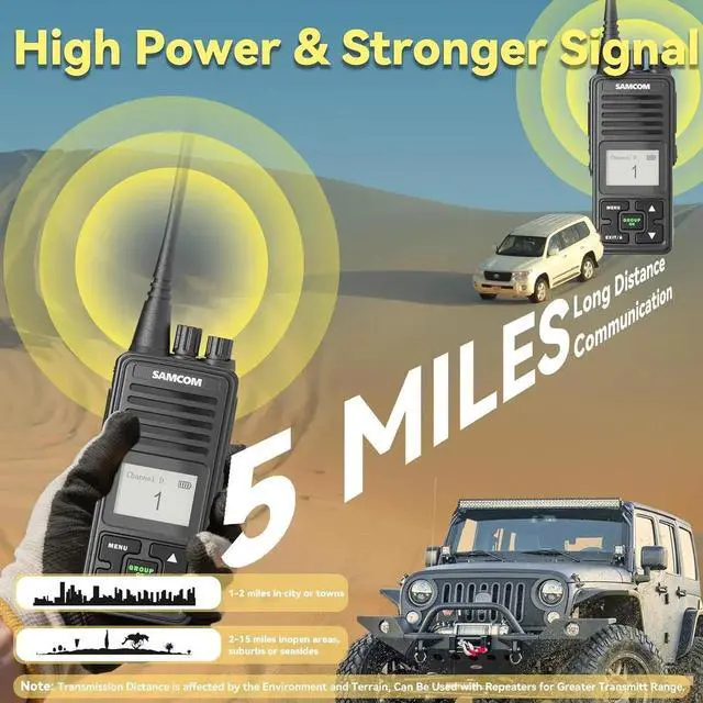 Long Distance 5 Miles Walkie TalkiesDelivers 2-5 mile range depending on terrain, with 2-watt transmission power for enhanced signal penetration in urban/buildings (actual range varies with obstacles and interference)