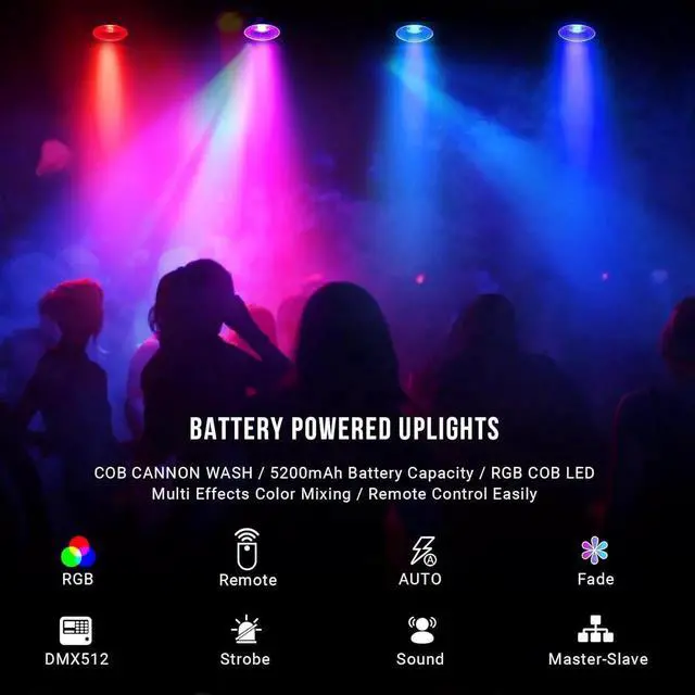 Advanced Control: Easily operated via remote control, DMX controller, built-in programs, or sound activation. Automatic modes include static color, strobe, dimming, gradual color change, and master/slave setups to suit different occasions. falseFlexible
