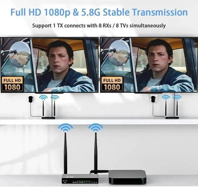 Full HD 1080p & 5.8G Stable TransmissionEquipped with a 5.8G chip and 4 strong antennas, wireless HDMI transmitter and receiver ensure stable signal transmission, free from interference by other wireless devices like WiFi or Bluetooth. With only 0.1 s latency, it supports resolutions of 480P, 576P, 720P, and 1080P@60Hz. Enjoy crystal-clear, uncompressed HD video and digital audio effortlessly