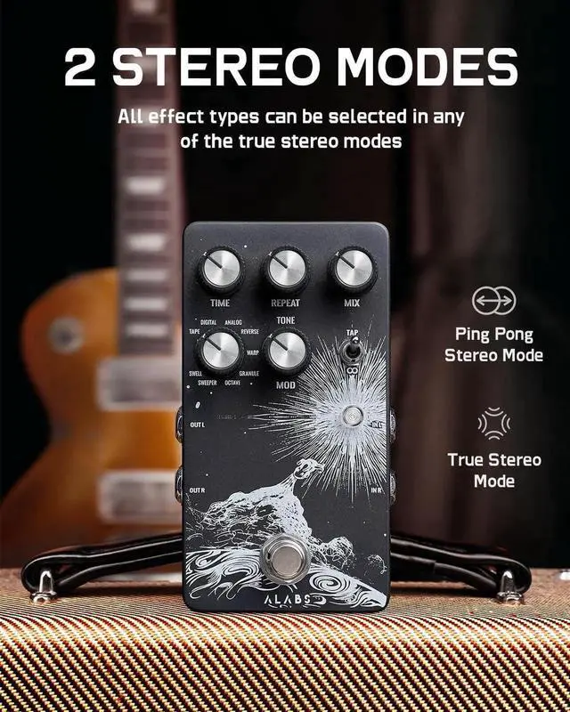 Multi-Expression Control: Explore Mode is similar to automated expression parameter control and can memorize the variation curves of the TIME / REPEAT /MX and MOD parameters within a 5-second timeframe for playback. Achieve dynamic variations and complex creative effects by simply holding down the footswitch to unleash multiple parameter transformationsfalse- 9 professional true stereo delays: Alabs TIMESLIP delay pedal provides 9 high-precision effects, including tape echo, digital, analog, reverse, warp, granule, octave, sweeper, and swell. All effect types can be further exaggerated by adjusting Mod parameter