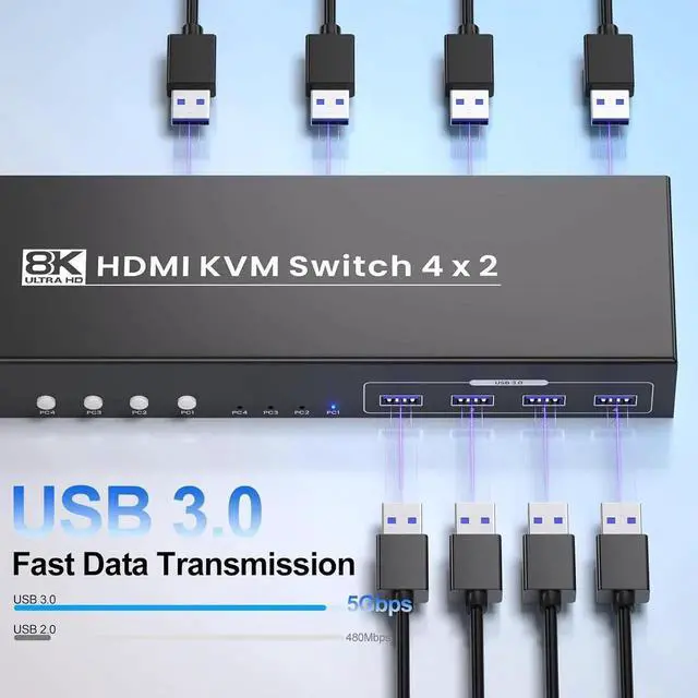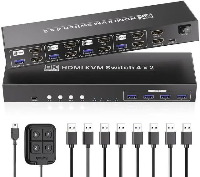 USB 3.0 8K Dual Monitor HDMI KVM Switch 4 ComputersHDMI KVM Switch 2 Monitors 4 Computers Effortless Multi-Display Control and Easy SwitchingElevate your workstation setup with the 8K 4 port HDMI KVM Switch, designed to handle 2 monitors and 4 computers with exceptional performance and versatility. Seamlessly manage and control up to 4 computers with a single set of keyboard, mouse, and two monitors.