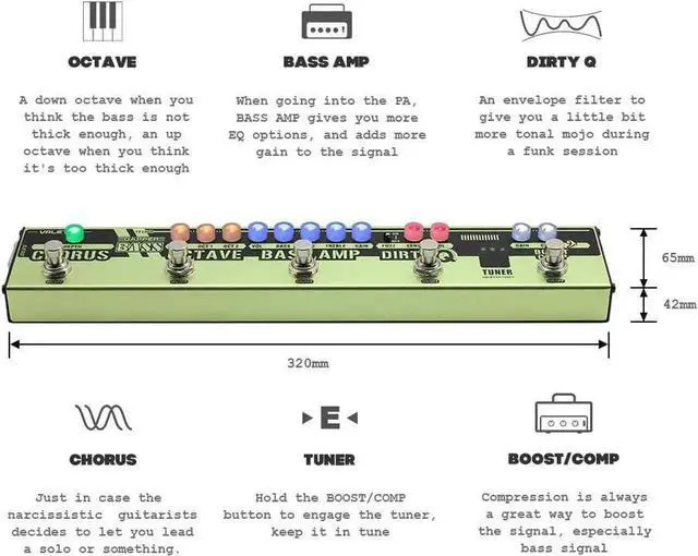 Analog Compressor/Boost, Envelope Filter (Auto Wah), Octave, Chorus, Everything you need on Bass EffectsfalseDry Signal Thru Output for running through some Parallel Effects or do some Re-Amping; FX Loop for Hooking up other EffectsfalseBuilt-in TUNER for Turning your Instrument at any time; 9V Center Negative Regular Pedal Power Supply (Adapter included) false- Analog Bass D. I. & Preamp with All in 1 Multi-Effects, extremely Compact and Easy to Carry, Great Partner of Gigging Musicians