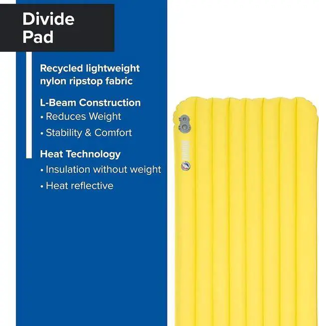falseLIFETIME WARRANTY All Big Agnes pads are individually inflated and tested at our factory ensuring 100% quality performance. All Big Agnes products are guaranteed against manufacturing or material defect. The wide regular 25x72 pad weighs just 24 oz. and packs to 4 x 8.5. false- The Divide is a light and compact warm-weather pad with a smooth and stable sleeping surface of vertical baffles at an incredible price. With an R-Value of 1.5, its the perfect pad for your summer and warm weather adventures.