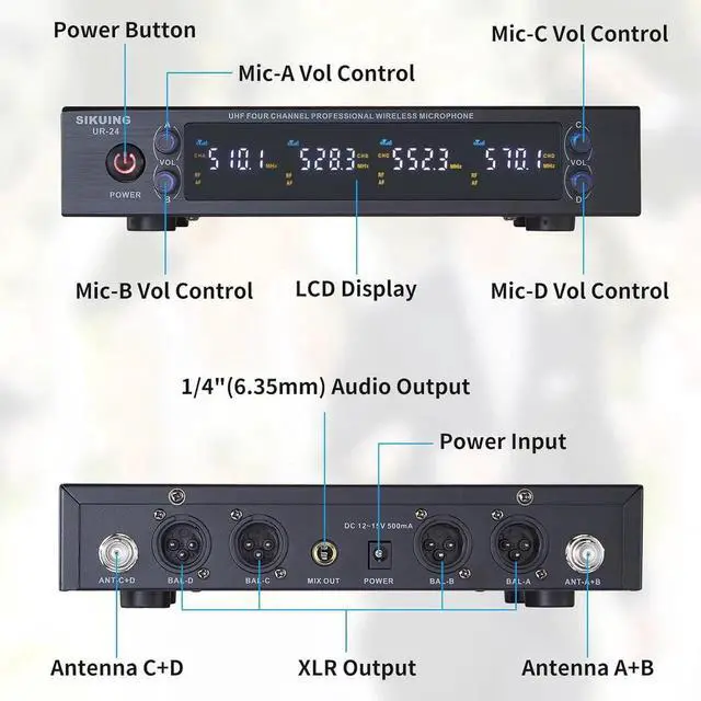- FLEXIBLE CONNECTION OPTIONSThe receiver has one 6.35 mm (1/4) TRS Output and 4 XLR Balanced Output for easy setup with your home karaoke or speaker system. It works with a wide range of sound bars, home receivers, speakers, audio mixers and etc.