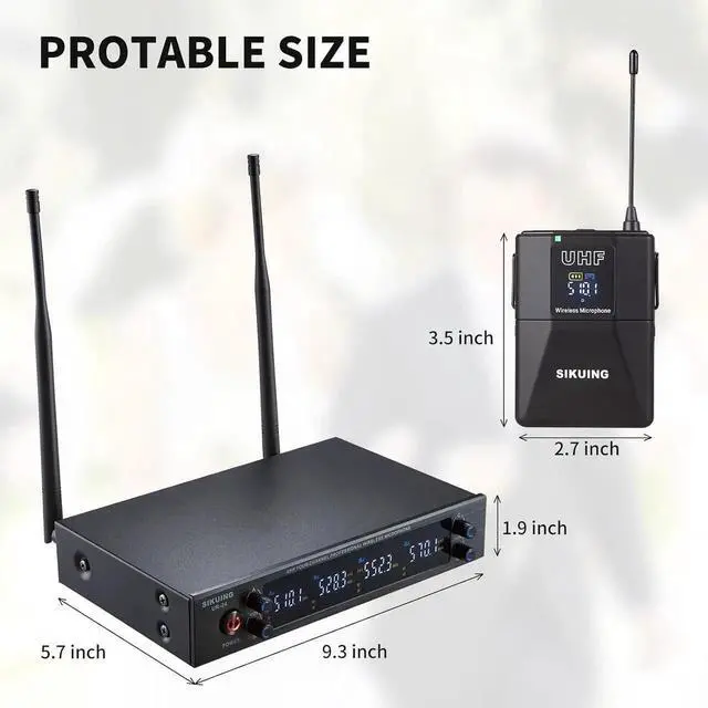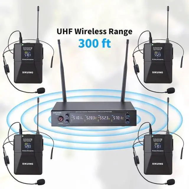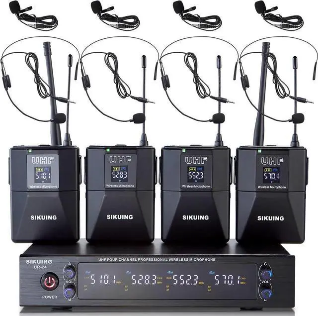 OCCASIONIts ideal for conferences, broadcasting, weddings, karaoke, social events and any small to medium-sized venues such as meeting rooms, auditoriums, schools, churches and small stages. falsePACKAGE CONTENT1 x UHF wireless receiver, 4 x Bodypack, 4 x Lavalier Microphone, 4 x Headset Microphone, 1 x power adapter, 1 x 6.35 mm audio cable, 4 x anti-rolling rings, 2 x Antennas, 1 x user manual. *Note: AA battery Not included. false- 4x50 ADJUSTABLE FREQUENCIESEach channel has 50 adjustable frequency groups for this microphone set in UHF 510-590MHz band, allowing multiple sets to use at the same time without interference. Operating distance is up to 300ft in open space line of sight.