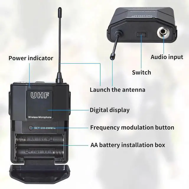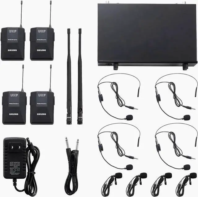 - PACKAGE CONTENT1 x UHF wireless receiver, 4 x Bodypack, 4 x Lavalier Microphone, 4 x Headset Microphone, 1 x power adapter, 1 x 6.35 mm audio cable, 4 x anti-rolling rings, 2 x Antennas, 1 x user manual. *Note: AA battery Not include