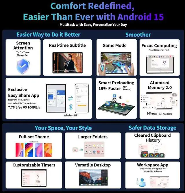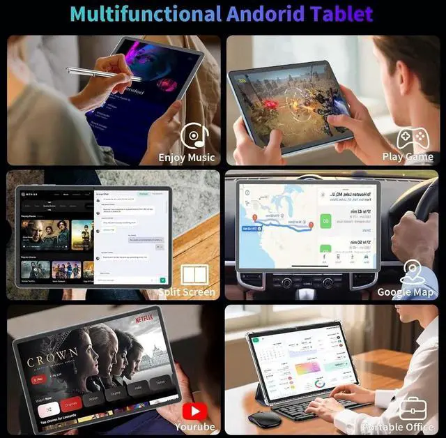 Multi-occasional UseAs the most cost-effective 11-inch Android 15 tablet, the tablet measures 26 x 17 x 0.8 cm and weighs 538 g. The 2 in 1 Tablet comes with a Bluetooth keyboard, wireless mouse, and foldable protective case, allowing it to be flexibly converted into laptop mode or computer mode.