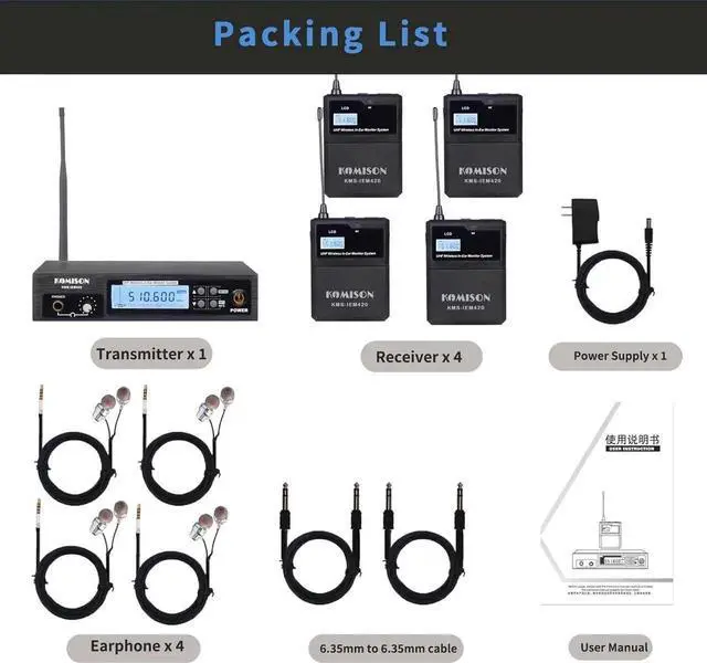 - What you get: 1 x UHF wireless transmitter, 4 x Bodypack receiver, 4 x In-ear earbuds, 1 x Power adapter, 1 x Antenna, 2 x 6.5 mm to 6.35 mm cable, 1 x User Manu