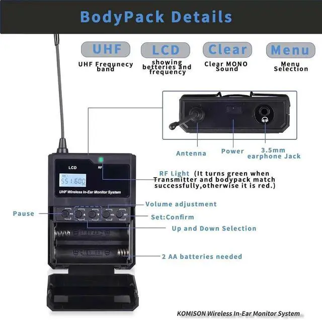- Transmitter and Bodypack: Metal construction for transmitter to ensure usage, while bodypack are Relatively small and refined, with independent volume control, Pause, frequency adjustment function. A Metal clip on the back of bodypack for carrying use. It works perfectly in various sound-monitoring occasions, stage performance, DJ, speech, lecture, studio recording, exhibit, instruction, musician, singer, guitar, etc