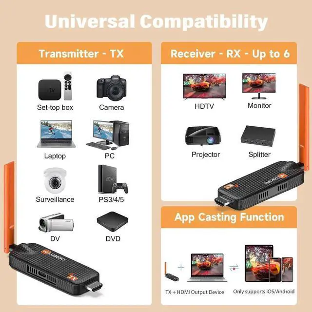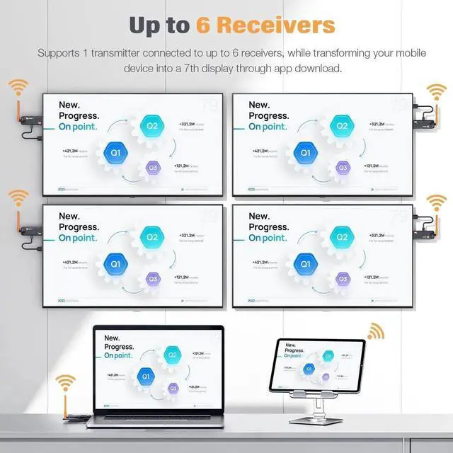 Support for Multiple ReceiversCast content to up to 6 receivers simultaneously with virtually no latency, ensuring smooth screen mirroring across multiple displays. With the upgraded chips, this wireless HDMI extender resolves overheating issues, allowing you to enjoy continuous use for an entire day without signal drops.