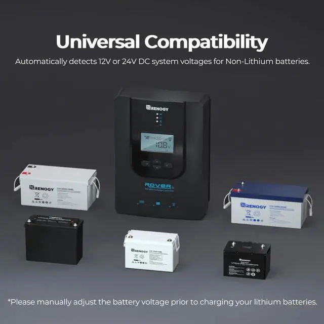 - 12/24 Automatically Detect and Multiple Battery Adaptation: Capable with and automatically detects 12V or 24V DC system voltages. Perfect for Sealed Lead Acid, GEL, Flooded Battery. Especially design of user mode to let user custom Lithium Battery parameter manually to solve the common issue of voltage matching of lithium battery.