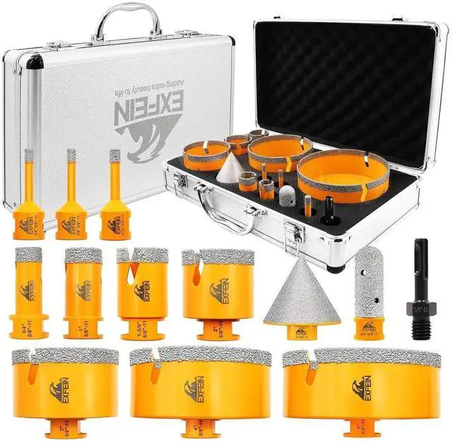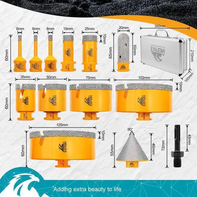 Diamond Tile Hole Saw Kit Pack of 13 Contains 10pcs diamond core drill bits; 1pc 4/5 inch diamond finger bit; 1pc 2 inch diamond chamfer bit; 1pc connect 5/8"-11 thread to SDS-plus adapter.