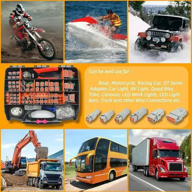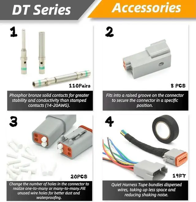 378PCS DT Connector: 2pin connector 12set, 3pin connector 6set, 4pin connector 6set, 6pin connector 4set, 8pin connector 2set, 12pin connector 1set. DT 16# solid contacts connector pins 110pcs, Socket 110pcs. Seal plug 20pcs, Stent 8pcs, Wire harness tape 1pcs, Removal Tool 1pcs, 4-indent pin crimp tool 1pcs, 0411-336-1605 2pcs, 15 compartment storage box 1pcs.