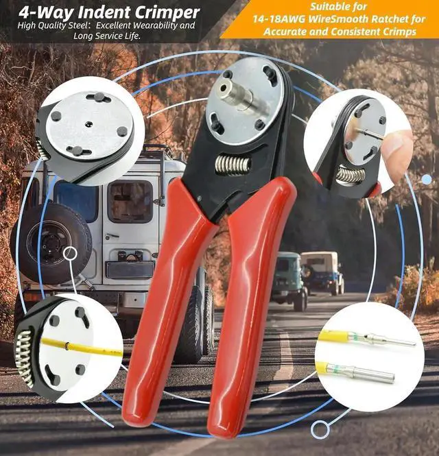 Professional Tools: Professional 4-way indent crimping tool for 12-20AWG Wire, smooth ratchet for accurate and consistent crimps. The Removal Tool can be used to remove wedgleocks and also release pins and sockets on several Deutsch series connectors. Compatible with DT, DTM, DTP, DRB, DTV, and STRIKE Series.