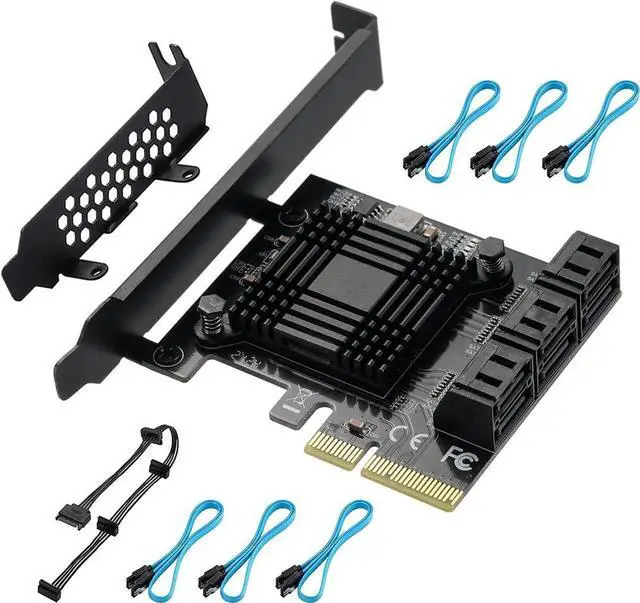 - Products includePCIE interface-4X SATA card 6 ports*1, SATA cable*6, low profile bracket*1, SATA power splitter cable*1. This SATA card does not support hardware RAID.