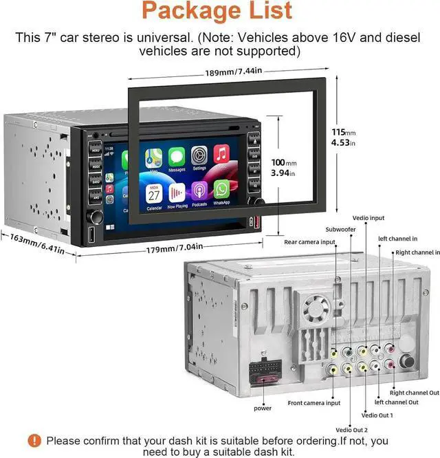 Extended Function: This Double din car stereo with DVD/CD player support audio output/input, video output/input, compatible with BT stereo car and hand-free calling, FM/AM Radio, USB, AUX-IN, music/video player, and reversing camera, camera cable, microphone, disassembly tool, brackets, screws, and power cable are included.