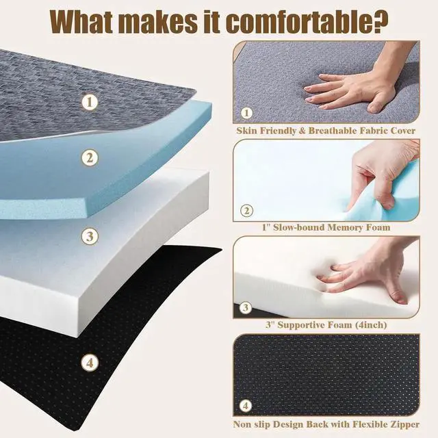- Premium Memory Foam + Supportive Base Layer: Crafted with 1" Slow-bound memory foam and 3" high-density support foam, this mattress conforms to your body while preventing sinkage. The optimal spinal alignment ensures a restful sleep, whether at home or on the go