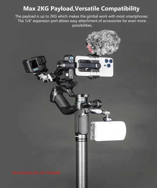 - Max 2KG Payload, Versatile CompatibilityThe payload is up to 2KG, making the gimbal work with most smartphones. The 1/4" expansion port allows easy attachment of accessories for even more possibilities.