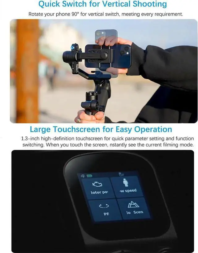- Large Touchscreen for Easy Operation 1.3 -inch high-definition touchscreen for quick parameter setting and function switching. You can instantly see the current filming mode when you touch the screen.