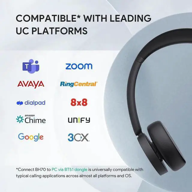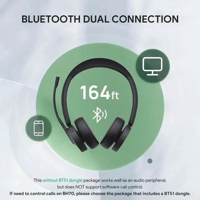 • Dual Connection BH70 wireless headset supports simultaneous connection of mobile phone and computer via Bluetooth 5.3 to enhance production efficiency and maintain absolute competitiveness. It does NOT support software call control as NOT include the BT51 dongle. **If you need to control calls on the headset, please choose the package that includes a BT51 dongle. Connect to PC via DONGLE to achieve compatibility with mainstream UC platform and perform soft-end call control.