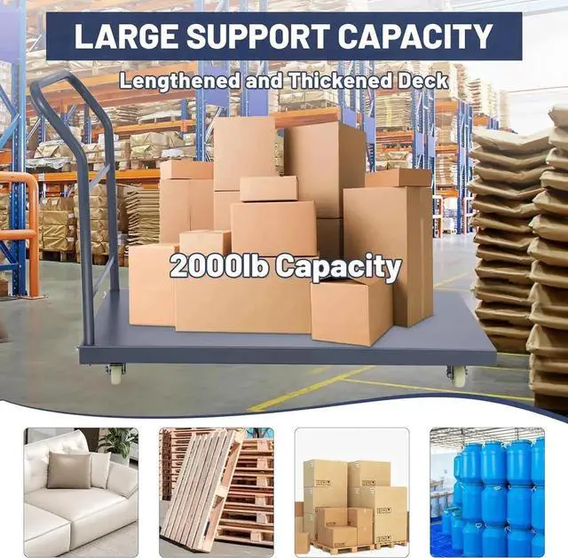 • 2000 lbs Bearing CapacityWith a generous 48"x24" flat surface, this platform truck cart provides ample space for moving large and bulky items. It supports up to 2000lbs, making it perfect for transporting heavy boxes, equipment, and furniture.