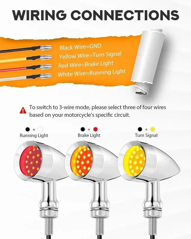 4 WIRES SET UP - Black wire for ground, red wire for brake lights, white wire for running lights, and yellow wire for turn signal. To switch to 3-wire modes, select three of the four wires based on your motorcycle's specific circuit.