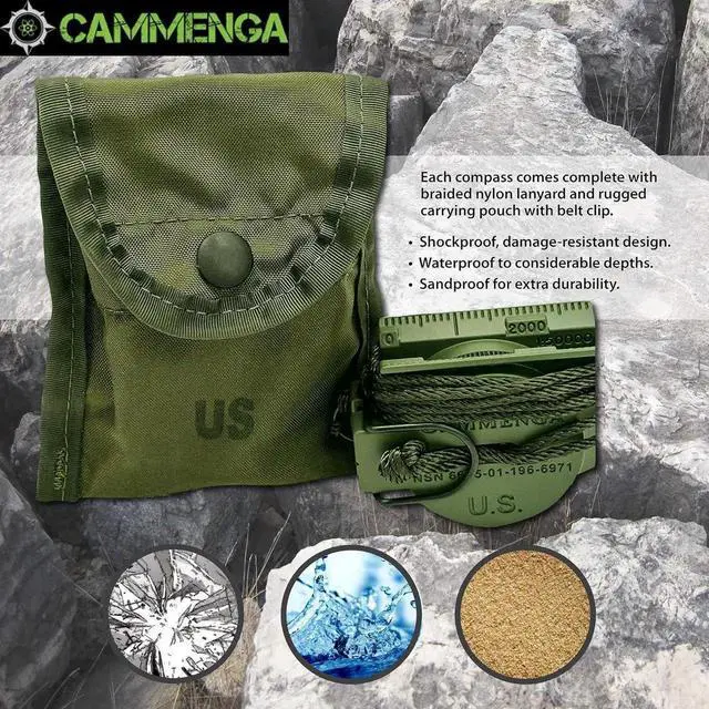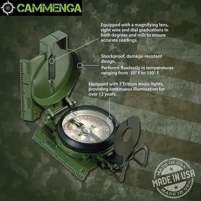 MADE TO LAST - This Cammenga 3H tritium compass is built to last in any condition. It is shockproof, water proof, damage resistant, and sand proof, and can keep functioning smoothly in any environment. falseALL WEATHER - Whether you are navigating through hot deserts or frigid mountain ranges, the Cammenga survival compass delivers unwavering performance across a wide range of -50° F to 150° F. falseEVERYTHING YOU NEED - The hiking compass comes equipped with everything you need for navigating. A carrying pouch, lanyard, warranty card, instruction booklet, and a clam shell storage case.