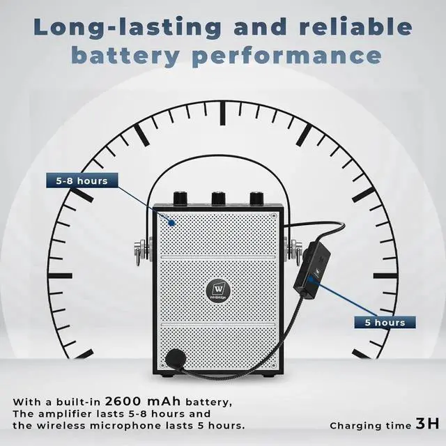Long Battery LifeThe portable megaphone has a built-in 2600mAh rechargeable battery that provides up to 5-8 hours of amplification on a single charge, ensuring that you won't have to interrupt your amplification during an event due to a depleted battery. No need to recharge frequently, making your use more convenient and long-lastingSupport Multiple ConnectivityEquipped with a newly upgraded Bluetooth 5.3 chip, this portable audio system ensures smooth wireless streaming and stable transmission while supporting TF card/USB/AUX/instrument connectivity, which is compatible with a wide range of devices such as various cell phones, iPads, tablets and more.
