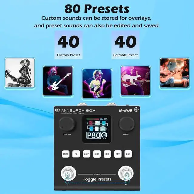 All-in-One Guitar Effects: The M-VAVE multi effects guitar pedal is a comprehensive solution for guitarists seeking a diverse range of effects. From distortion and modulation to delay and reverb, this pedal has it all. lt has 80 editable Presets, the users also can customiz effectors chain and save. Now you can download to update your firmware on hoerevmusic website.