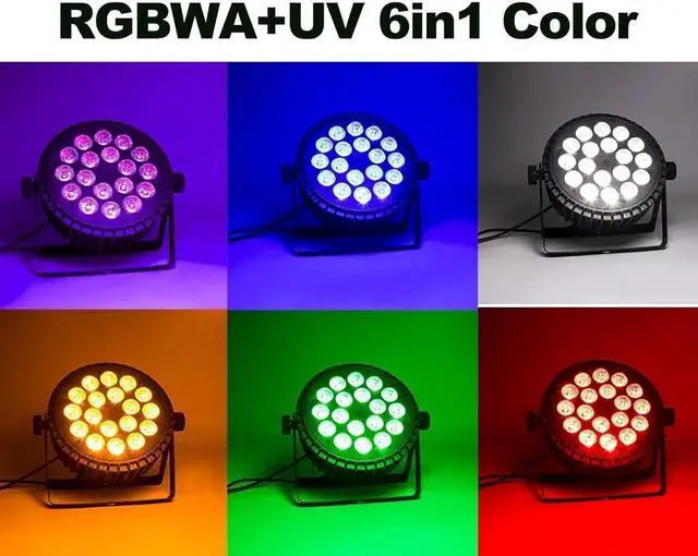 Color Stage Effect: 18 LEDs RGBWA+UV including red, green, blue, white, amber, purple, and mixed color. Color changing and light dimming are available, which could meet your mand stage need.