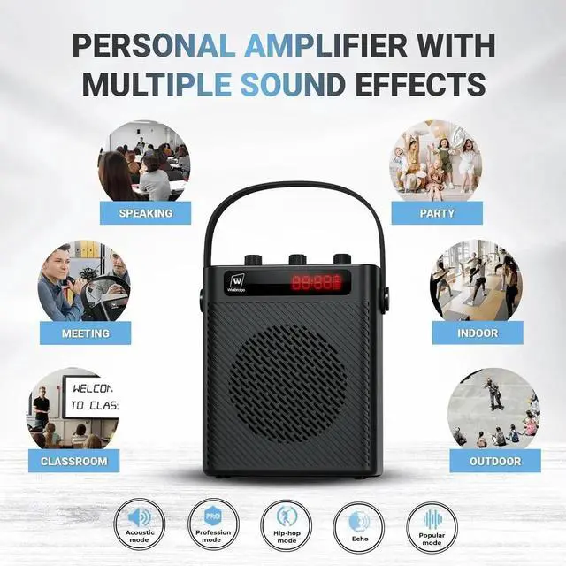- Multi-Functional PA System with 4 Sound EffectsNot only is it a professional personal pa system, it can also be used as a karaoke system. It boasts four distinct sound effects modes acoustic, professional, popular, and hip-hop along with adjustable reverb via the ECHO button. Supporting dual microphone usage, its user-friendly interface makes it suitable for users of all ages, ensuring everyone can participate in the fun. A perfect gift for loved ones.