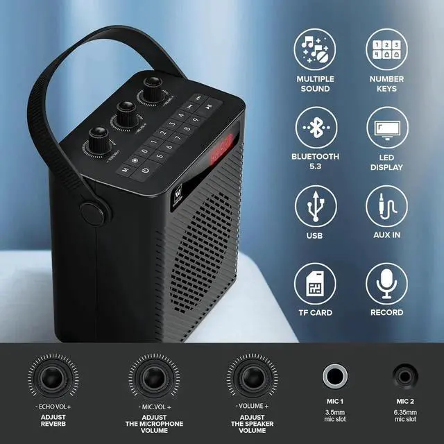 - 5.3 Bluetooth Speaker with MicrophonesEasily stream and control music via Bluetooth 5.3, with a range of up to 100 feet. Alternatively, play tunes from USB drives, TF cards, or MP3 players. Supports simultaneous amplification and playback. Plus, capture important moments anytime, anywhere with the built-in recording function.