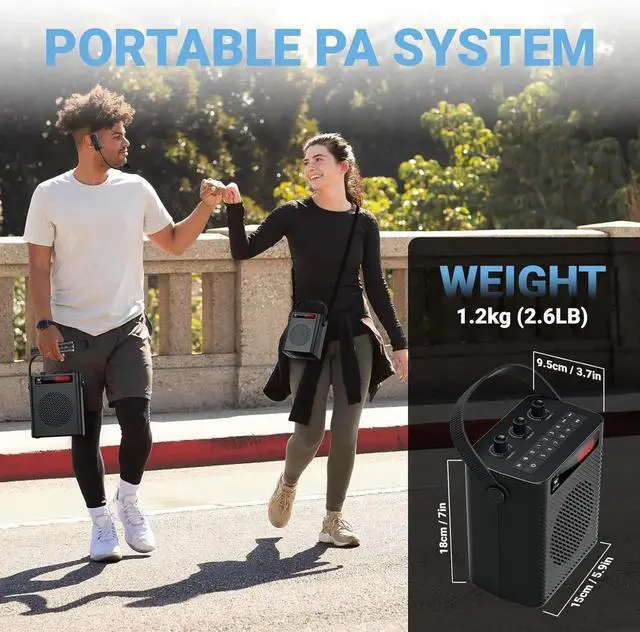 Multi-Functional PA System with 4 Sound EffectsNot only is it a professional personal pa system, it can also be used as a karaoke system. It boasts four distinct sound effects modes acoustic, professional, popular, and hip-hop along with adjustable reverb via the ECHO button. Supporting dual microphone usage, its user-friendly interface makes it suitable for users of all ages, ensuring everyone can participate in the fun. A perfect gift for loved ones 5.3 Bluetooth Speaker with MicrophonesEasily stream and control music via Bluetooth 5.3, with a range of up to 100 feet.