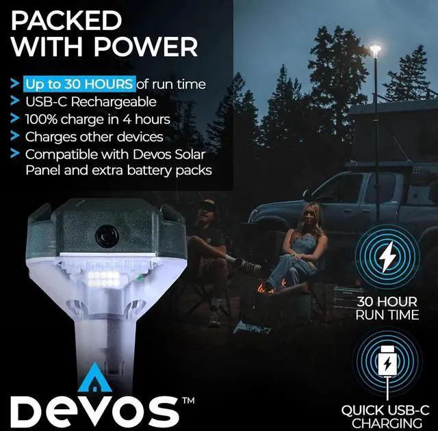& Efficient Charging: Recharge quickly from 0 to 100% in just 4 hours via USB-C. Includes a rechargeable camping light with stand, adjustable pole, tripod base, carry bag, and charging cord. falseDurable