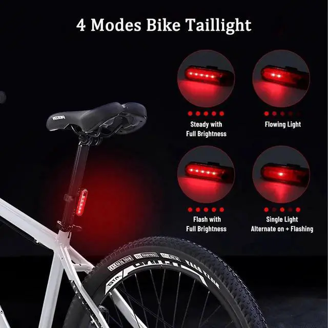 - Multiple Modes4 lighting modes, which can adapt to different scenes. Besides being used as a bicycle light, you can also use it for night running, camping, fishing, night work and activities, etc. The tail light has 4 modes, 5 lights on, single light alternate on, flashing, single light alternate on+flashing. It is also a good choice as a gift. So, start your next adventure with u